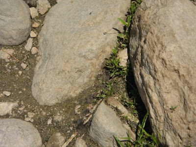 I literally almost walked into a HUGE California King Snake on our little walk in Eaton Canyon on July 13 in Pasadena...It's a bit like "Where's Waldo." In top photo: Look at dark black spot on rock in middle of photo, & to right you can see the lower part of body running down in grass from top to bottom in space between boulder & rock. In middle photo, same thing; look in grass in crevice of rocks for yellow/brown striped snake. In bottom photo, you can find striped tail end in middle of photo, & follow body up. Gorgeous snake, but couldn't get camera ready fast enough to show all its glory...